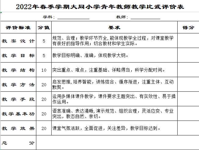 教學質量是學校永恒的主題,課堂教學是教學工作的中心環(huán)節(jié),直接關系到教學質量的優(yōu)劣。為提高學校課堂教學水平,增強課堂教學效果,提高青年教師的專業(yè)知識、專業(yè)技能和專業(yè)品質,促進青年教師的迅速成長,并進一步規(guī)范教師的課堂教學行為、提高教師的課堂教學設計水平和駕馭課堂教學的能力,減少課堂無效、低效行為,為學??沙掷m(xù)發(fā)展提供堅實的保證。大同小學于2022年3月13日至5月13日舉行青年教師教學比武活動。